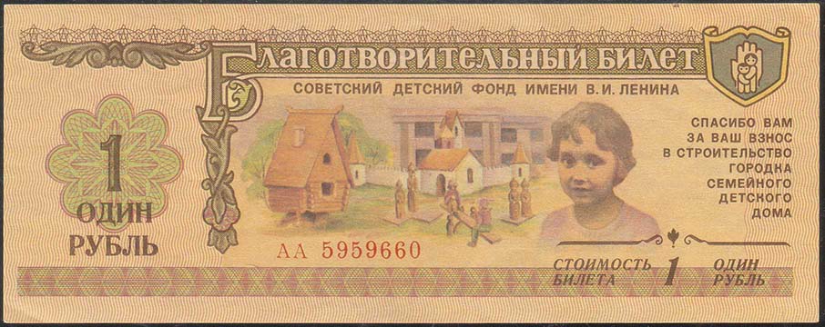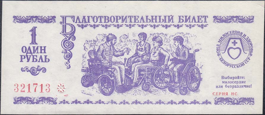 1989(?) г. Разм. 150 х 64 мм. Одноцветная двухсторонняя печать на белой бумаге переменной плотности с имитацией ВЗ. На лицевой стороне в центре грумма инвалидов на колясках. Сверху текст: «Благотворительный билет». Слева номинал и номер. Справа эмблема, девиз фонда и серия. На оборотной стороне в…