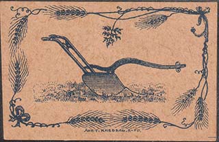 1915(?) г. Разм. 65 х 42 мм. Одноцветная печать на белой бумаге. В декоративной рамке из колосьев пшеницы в центре плуг.