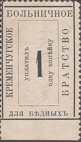 1915(?) г. Разм. 66 х 48 мм. Одноцветная печать на бумаге различных цветов. Зубц. 11 1/2. Разм. рамки 24 х 37,5 мм в центре в прямоугольной рамке разм. 13 х 28 мм номинал и вертикально текст: «Уплатить ... копейки». По периметру между рамками текст: «Кременчугское Больничное Братство для бедных».
