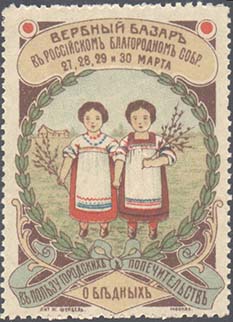 1910(?) г. Разм. рис. 36 х 50 мм. Многоцветная печать на белой бумаге. Зубц. 12 1/2. С клеем. В центре в обрамлении венка двое детей. Сверху текст в три строки: «Вербный базар в Российском Благородном собр[ании]. 27, 28,29 и 30 марта». Внизу на ленте текст в две строки: «В пользу городских попечи…