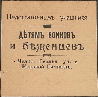 1915(?) г. Разм. 51 х 51 мм. Одноцветная печать на сероватой бумаге. В центре текст в пять строк: «Недостаточным учащимся детям воинов и беженцев Мелит[опольских]. Реальн[ого]. Уч[илища]. И Женской Гимназии». Между строками текста декоративные элементы.