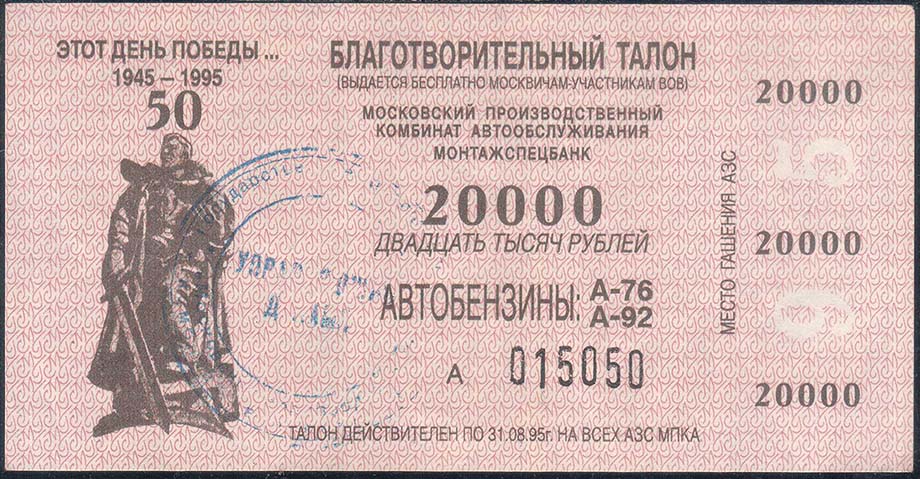 1995 г. Листок разм. 115 х 59 мм. Двухцветная печать на белой бумаге с В.З. На фоне из букв в центре текст в десять строк: «Благотворительный талон (выдается бесплатно москвичам-участникам ВОВ). Московский производственный комбинат автообслуживания монтажспецбанк. 20000 Двадцать тысяч рублей. Авт…