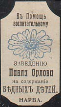 1915(?) г. Виньетка в виде фигурного щитка сложной формы разм. 31 х 55 мм. Двухцветная печать на кремовой бумаге. В центре цветок ромашки. Сверху текст в две строки: «В помощь воспитательному». Внизу продолжение текста в пять строк: «Заведению Павла Орлова на содержание бедных детей. Нарва».
