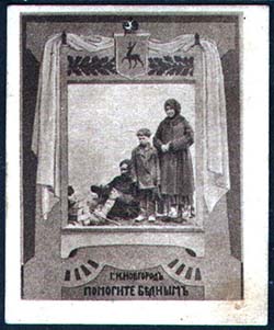 1915(?) г. Разм. рамки 35 х 45 мм. Двухцветная печать на толстой желтоватой бумаге. В центре в декоративной рамке трое бедных. Сверху герб Нижнего Новгорода. Внизу текст в две строки: «г. Н[ижний]. Новгород. Помогите бедным».