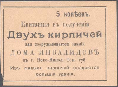 1915(?) г. Разм. 66 х 48 мм. Одноцветная печать на желто-ватой бумаге. В центре в прямоугольной рамке разм. 58,5 х 42 мм текст в восемь строк: «5 копеек. Квитанция в получении Двух кирпичей для сооружающегося здания Дома Инвалидов в г. Ново-Никол[аевске]. Том[ской]. Губ[ернии]. Из малых кирпичей …
