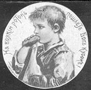 1914(?) г. Разм. 26 х 35 мм. Зубц. 11. Двухцветная печать на сероватой бумаге. Дама с девочкой. Сверху текст в две строки: «Помогите несчастным детям». Справа продолжение текста в четыре строки: «Купите красное яичко. 28 марта». Внизу мелким шрифтом текст в пять строк: «В пользу детских трудовых …
