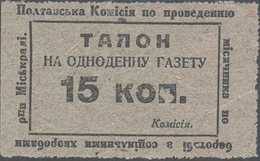 1925 г. Разм. 87 х 51 мм. Одноцветная печать на серо-зеленой бумаге низкого качества. Нерегулярная зубц. В центре в прямоугольной рамке разм. 63 х 38 мм текст в две строки на украинском языке: «Талон на однодневную газету». В центре номинал: «15 коп». Справа внизу текст на украинском языке: «Коми…