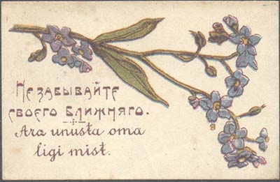 1913 г. 15.06.1913 г. Разм. 66 х 43 мм. Многоцветная печать на белой бумаге. Ветка с цветами. Текст на русском и эстонском языках: «Не забывайте своего Ближнего».