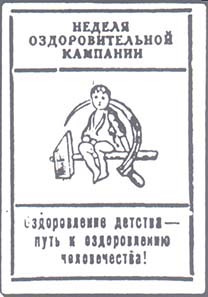1926(?) г. Разм. 34 х 52 мм. Одноцветная печать на белой бумаге. В прямоугольной рамке разм. 31 х 46 мм в центре серп и молот, на рукоятке которого сидит ребенок. Сверху текст в три строки: «Неделя оздоровительной компании». Внизу текст в три строки: «Оздоровление детства – путь к оздоровлению че…