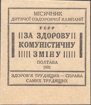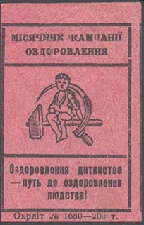 1926(?) г. Разм. 31 х 45 мм. Одноцветная печать на розовой бумаге. В прямоугольной рамке в центре серп и молот, на рукоятке которого сидит ребенок. Сверху текст на украинском языке в две строки: «Месячник компании оздоровления». Внизу текст на украинском языке в три строки: «Оздоровление детства …