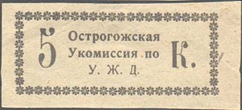1926 г. Разм. 59 х 26 мм. Одноцветная печать на сероватой бумаге. В декоративной прямоугольной рамке разм. 50 х 20 мм текст в три строки: «Острогожская Укомиссия по У.Ж.Д.». Слева номинал.