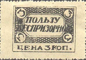 1924 г. Разм. рамки 36 х 26 мм. Одноцветная печать на желтоватой (оттенки) бумаге. Нерегулярная зубцовка. В центре в прямоугольной рамке на фоне в виде сетки восьмиугольная рамка, в которой текст в две строки: «В пользу беспризорного». По углам рамки номинал. Внизу текст: «Цена 3 коп.».