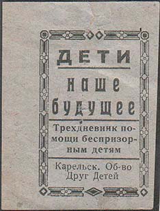 1930(?) г. Разм. 35 х 50 мм. Одноцветная печать на тонкой светло-синей бумаге. В прямоугольной декоративной рамке разм. 27 х 41 мм сверху текст в три строки: «Дети наше будущее». В центре текст в три строки: «Трехдневник помощи беспризорным детям». Внизу текст в две строки: «Карельск[ое]. Об-во …