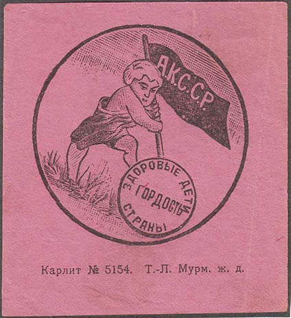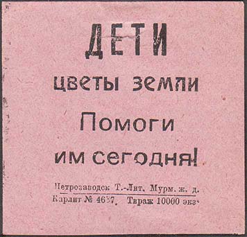 1927 г. Разм. 60 х 57 мм. Одноцветная печать на тонкой светло-розовой бумаге. В центре текст в четыре строки: «Дети цветы земли. Помоги им сего-дня!». Внизу мелким шрифтом выходные данные: «Петрозаводск Т.-лит. Мурм. Ж.Д. Карлит №4673. Тираж 10000 экз.».
