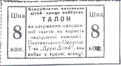 1930(?) г. Разм. по перфорации 66 х 43 мм. Одноцветная печать на тонкой серо-зеленой бумаге. Не-регулярная зубц. В центре в прямоугольной рамке разм. 54 х 28 мм в центре текст на украинском языке в семь строк: «Талон на право приобретения однодневной газеты в пользу оздоровительной компании Полта…