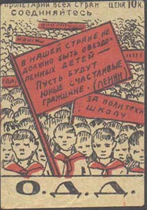 1932 г. 04.05.1932 г. Разм. 35 х 50 мм. Двухцветная печать на тонкой желтоватой бумаге. В центре большая группа пионеров с транспарантами. Сверху текст в две строки: «Пролетарии всех стран соединяйтесь!». В правом верхнем углу номинал: «Цена 10 к.». Внизу крупными буквами аббревиатура «О.Д.Д.». На…