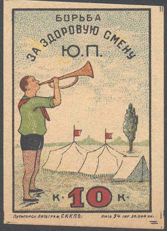 1924(?) г. Разм. 53 х 76 мм. Многоцветная печать на кремовой бумаге. В центре в прямоугольной рамке разм. 46 х 67 мм пионер с горном на фоне палаток. Сверху текст в три строки: «Борьба за здоровую смену Ю.П.». Внизу номинал. Внизу под рамкой выходные данные мелким шрифтом: «Пятигорск Литограф. СК…