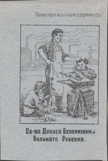 1924(?) г. Листок разм. 112 х 75 мм. Одноцветная двухсторонняя печать на толстой серо-голубой бумаге низкого качества. На лицевой стороне в прямоугольной рамке разм. 55 х 69 мм Рабочий и двое детей на фоне заводов. Сверху текст: «Пролетарии всех стран соединяйтесь». Внизу текст в две строки: «Об-…