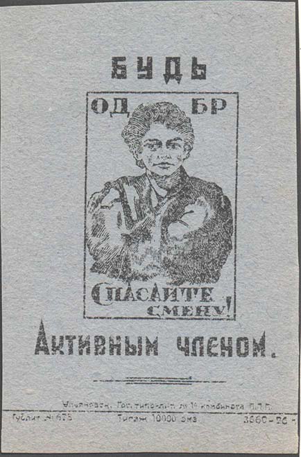 1924(?) г. Листок разм. 110 х 73 мм. Одноцветная печать на толстой серо-голубой бумаге низкого качества. На лицевой стороне в прямоугольной рамке разм. 37 х 56 мм поясное изображение беспризорника. Сверху аббревиатура «ОДБР». Внизу текст: «Спасайте смену!». Сверху над рамкой текст: «Будь». Внизу …