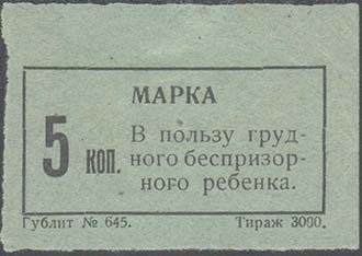 1928 г. 02.10.1928 г. Разм. 52 х 30 мм. Одноцветная печать на бумаге различных цветов. В прямоугольной рамке разм. 46 х 23 мм текст в четыре строки: «Марка. В пользу грудного беспризорного ребенка». Слева номинал. Внизу под рамкой выходные данные мелким шрифтом: «Гублит № 645 Тираж 3000».