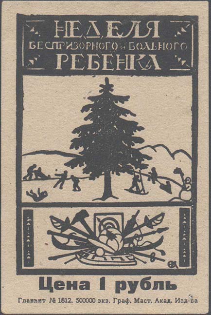 1925(?) г. Листок разм. 73 х 111 мм. Одноцветная печать на розово-серой бумаге. В центре в прямоугольной рамке разм. 63 х 90 мм елка, горки и играющие дети. Сверху текст в три строки: «Неделя беспризорного и больного ребенка». Внизу разнообразный спортивный инвентарь. Внизу под рамкой номинал и в…