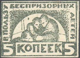 1925 г. Разм. рамки 32 х 43 мм. Одноцветная печать на белой бумаге. В прямоугольной рамке в центре в круге двое беспризорных детей. Сверху текст в две строки: «В пользу беспризорных детей». Внизу номинал.