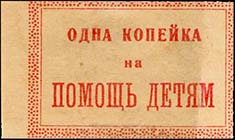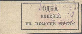1925(?) г. Разм. рамки 23 х 40 мм. Одноцветная печать на белой бумаге. В прямоугольной рамке в центре текст в три строки: «... (номинал текстом) на помощь детям».