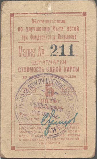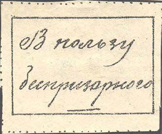 1925(?) г. Разм. 56 х 45 мм. Одноцветная печать на бумаге различных цветов. В прямоугольной рамке разм. 49 х 33 текст от руки: «В пользу беспризорных».