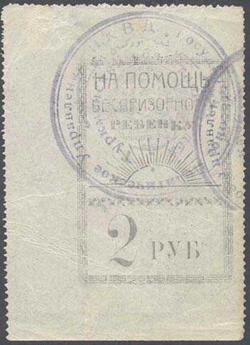 1931 г. Разм. по перфорации 55 х 77 мм. Одноцветная печать на сероватой бумаге с вертикальными полосками «Верже». Зубц. 11 1/2. В центре в прямоугольной рамке с геометрическим орнаментом разм. 36 х 54 мм сверху текст в три строки на фоне лучей восходящего солнца: «На помощь беспризорному ребенку»…