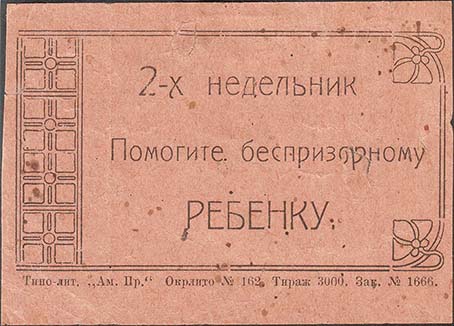 1926(?) г. Разм. 77 х 55 мм. Одноцветная печать на желто-серой бумаге. В центре в прямоугольной рамке с геометрическим орнаментом слева и растительным справа текст в три строки: «2-х недельник Помогите беспризорному ребенку». Внизу под рамкой мелким шрифтом выходные данные неразборчиво.