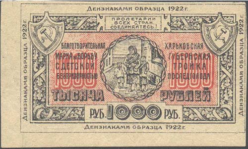 1922 г. Разм. рамки 76 х 44 мм. Двухцветная печать на желто-серой рыхлой бумаге различного качества. В центре в двойной декоративной прямоугольной рамке в дополнительной круглой рамке женщина с двумя детьми на фоне городских построек. Слева и справа номинал. Слева на фоне цифр номинала текст в че…