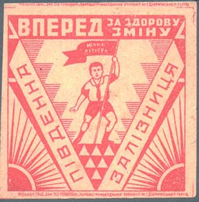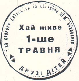 1925(?) г. Ромб разм. 43 х 73 мм. Одноцветная печать на желтоватой бумаге. В центре в двойной рамке в форме ромба текст на украинском языке в четыре строки: «Да здравствует 1-е мая». Внизу декоративный элемент. По периметру между рамками текст на украинском языке: «О-во охраны детства и содействи…