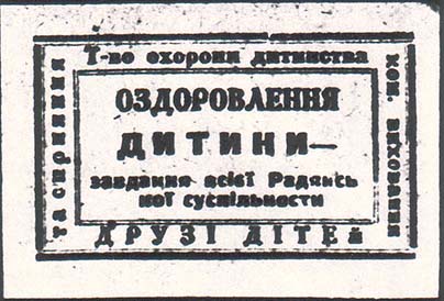 1930(?) г. Разм. рамки 59 х 35 мм. Одноцветная печать на желто-серой бумаге. В двойной прямоугольной рамке в центре текст на украинском языке в че-тыре строки: «Оздоровление детей – дело всей советской общественности». По периметру между рамками текст ну украинском языке: «О-во охраны детства и с…