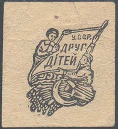 1925(?) г. Круг диам. 45 мм. Одноцветная печать на толстой желтоватой бумаге. В центре текст на украинском языке в три строки: «Да здравствует 1-е мая». По окружности текст на украинском языке: «О-во охраны детства и содействия ком[мунистическому] восп[итанию] «Друзья детей»».