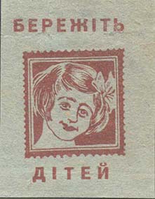 1924(?) г. Разм. 37 х 48 мм. Одноцветная печать на зелено-серой бумаге. В центре в прямоугольной рамке, имитирующей зубцовку разм. 24 х 26 мм голова девочки. Текст на украинском языке: «Берегите детей».