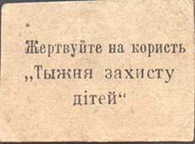 1924(?) г. Разм. 38 х 27 мм. Одноцветная печать на тонкой сероватой бумаге. В центре текст в три строки на украинском языке: «Жертвуйте в помощь «Недели защиты детей»».