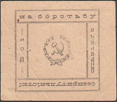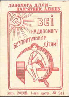 1926(?) г. Разм. 75 х 67 мм. Одноцветная печать на желтоватой бумаге низкого качества. В центре в двойной прямоугольной рамке разм. 55 х 53 мм серп и молот в обрамлении венка. По периметру между рамками текст на украинском языке: «Все на борьбу с детской беспризорностью».