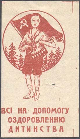1930(?) г. Разм. 41 х 50 мм. Одноцветная печать на тонкой розово-серой бумаге. В центре в толстой рамке разм. 34 х 44 мм с закругленными краями серп и молот, на рукоятке которого сидит мальчик. Текст в три строки на украинском языке: «В пользу компании оздоровления детей». Внизу под рамкой мелким…