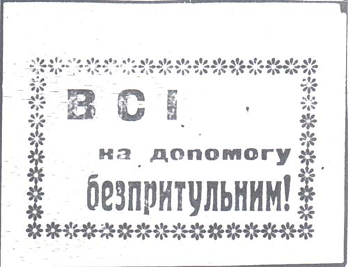 1926(?) г. Разм. 84 х 64 мм. Одноцветная печать на светло-оранжево-серой бумаге. В центре в прямоугольной рамке из декоративных элементов в виде цветков разм. 71 х 44 мм текст на украинском языке в три строки: «Все на помощь беспризорным».