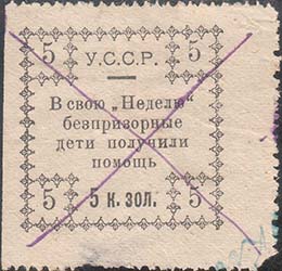 1926(?) г. Разм. по перфорации 41 х 41 мм. Одноцветная печать на плотной кремовой бумаге. Зубц. 11 1/2. В прямоугольной декоративной рамке разм. 31 х 31 мм в центре текст в четыре строки: «В свою «Неделю» беспризорные дети получили помощь». По углам цифры номинала. Сверху аббревиатура «У.С.С.Р.».…