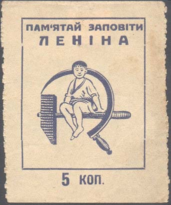 1926(?) г. Разм. 57 х 69 мм. Одноцветная печать на белой бумаге. В центре в прямоугольной рамке разм. 42 х 51 мм серп и молот, на рукоятке которого сидит мальчик. Сверху текст в две строки на украинском языке: «Помни заветы Ленина». Внизу под рамкой номинал.