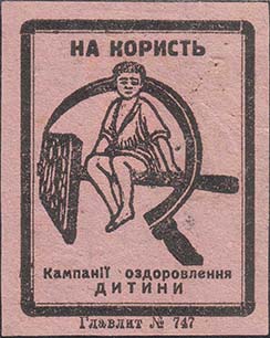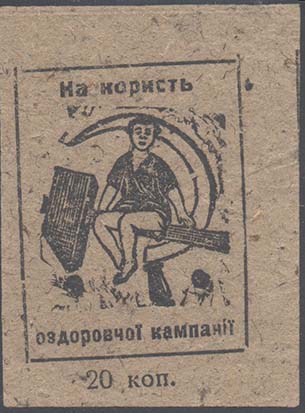 1926(?) г. Разм. 50 х 68 мм. Одноцветная печать на серой бумаге низкого качества. В прямоугольной рамке разм. 38 х 50 мм серп и молот, на рукоятке которого сидит ребенок. Текст в две строки на украинском языке: «В пользу оздоровительной компании». Внизу под рамкой номинал.