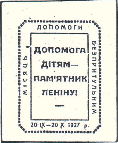 1927 г. 20.09.-20.10.1927 г. Разм. 65 х 67 мм. Одноцветная печать на плотной серовато-зеленой бумаге. В центре в двойной прямоугольной рамке 40 х 53 мм со скошенными углами текст на украинском языке в четыре строки: «Помощь детям – памятник Ленину!». По периметру между рамками текст на украинском …