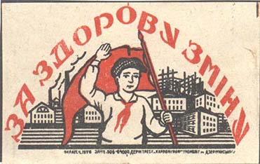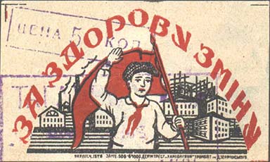 1928 г. Разм. 63 х 39 мм. Двухцветная печать на белой бумаге. В центре пионер со знаменем на фоне городских построек. Сверху полукругом текст на украинском языке: «За здоровую смену». Внизу мелким шрифтом выходные данные неразборчиво.