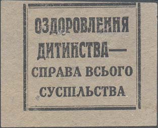 1930(?) г. Разм. 52 х 43 мм. Одноцветная печать на тонкой зелено-серой бумаге. В центре в двойной рамке разм. 39 х 36 мм текст четыре строки на украинском языке: «Оздоровление детей – задача всей общественности».