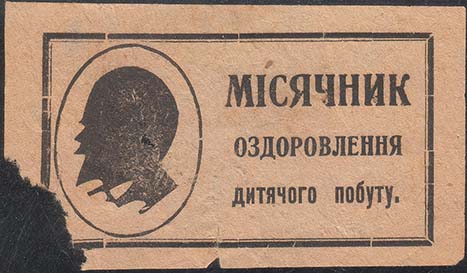 1930(?) г. Разм. 78 х 44 мм. Одноцветная печать на желтоватой бумаг. В двойной прямоугольной рамке разм. 66 х 36 мм слева в овальной рамке силуэт В.И.Ленина. Справа текст в три строки на украинском языке: «Месячник оздоровления детского быта».