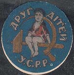 1930(?) г. Круг диаметром 25 мм. Многоцветная печать на белой бумаге. Серп и молот, на рукоятке которого сидит мальчик. По периметру текст на украинском языке: «Друг Детей. УССР».