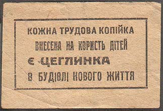 1930(?) г. Разм. 54 х 37 мм. Одноцветная печать на желтоватой бумаге. В прямоугольной рамке разм. 45 х 24 мм текст на украинском языке в четыре строки: «Каждая трудовая копейка внесенная в пользу детей это кирпич в строительстве новой жизни».