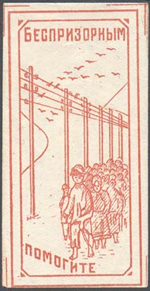 1925(?) г. Разм. рамки 31 х 66 мм. Одноцветная печать на белой бумаге. В центре в двойной прямоугольной рамке группа беспризорных детей на фоне телеграфных столбов и косяка птиц. Сверху текст: «Беспризорным» внизу продолжение текста: «Помогите». По углам знака разграничительные линии.
