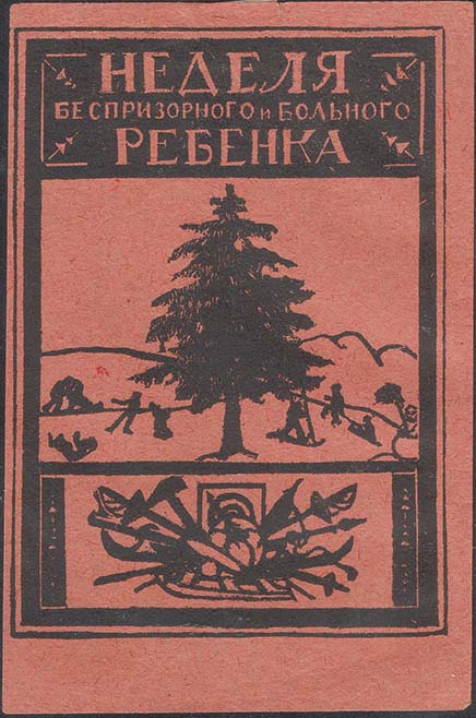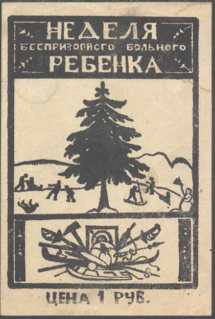 1925(?) г. Листок разм. 73 х 99 мм. Одноцветная печать на бумаге различных цветов. В центре в прямоугольной рамке разм. 66 х 94 мм елка, горки и играющие дети. Сверху текст в три строки: «Неделя беспризорного и больного ребенка». Внизу разнообразный спортивный инвентарь.